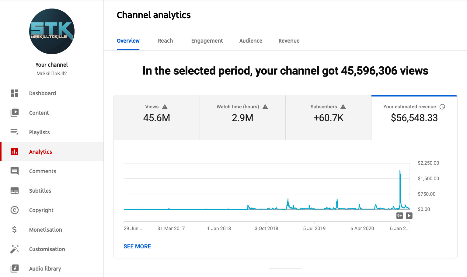 On this channel we upload comedy and VFX based videos and we have grown this channel to 472,000 subscribers and 60 Million + views and the YouTube revenue from this channel is around 12,800$ Or 9.3 Lakhs INR.